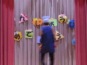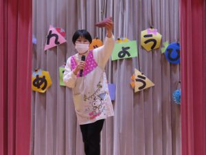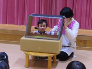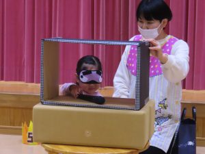 目隠しをしたお友達が、箱の中身をそーっと触って、当てますが・・・